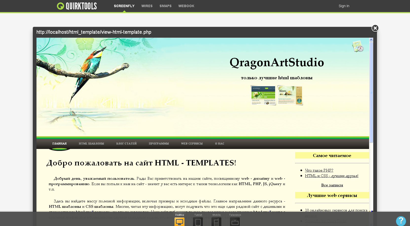 На этом сервисе можно легко просмотреть сайт в различных разрешениях, включая мобильные телефоны, планшеты и даже телевизоры, что сейчас становитьбся все боле и более актуальным. Хватит себя мучать и менять разрешения на своем ПК, пользуйтесь Screenfly by QuirkTools .